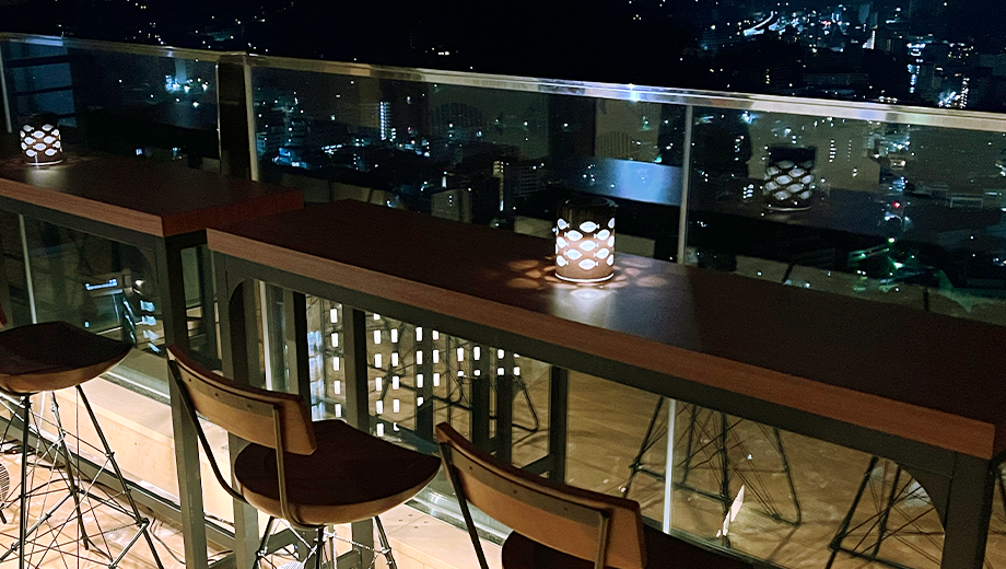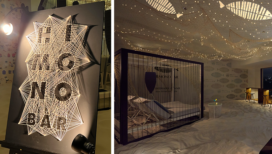 ありがたいことに、イベントは毎年ご好評をいただき、昨年は星野リゾート内でもメディア露出の多いイベントになったという。今年はさらに装飾範囲を広げ、屋外バルコニーに新たなカウンター席を設置した。ハイチェアの脚にもストリングアートを施し、間接照明と組み合わせて室内から屋外まで一体感のある空間に仕上げた。卓上のランタンは干物ロゴが映し出されるようにオリジナルで制作。ここでも光の演出に一工夫を加えた。