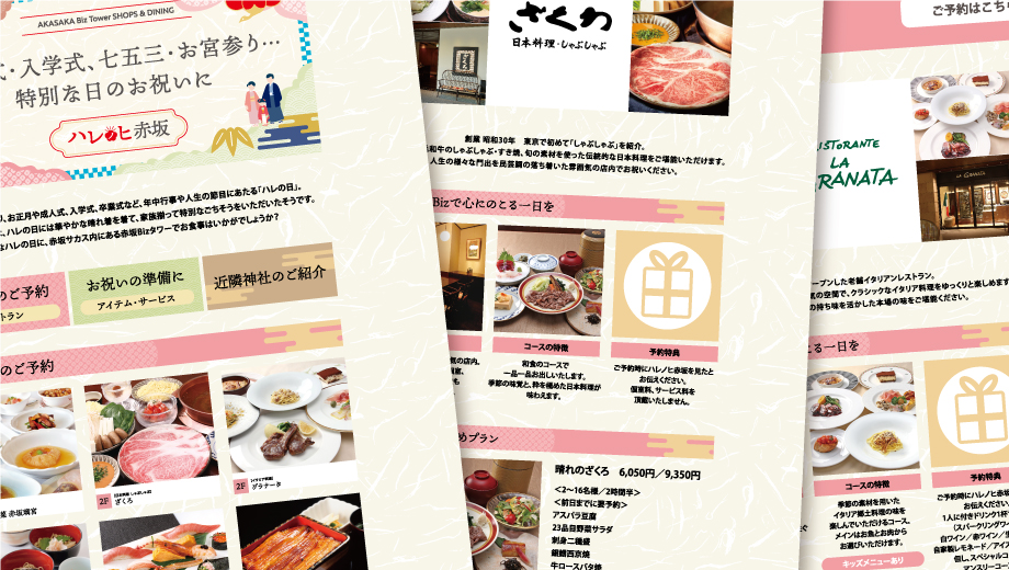ハレの日、家族でのちょっと贅沢なお食事を楽しめるレストランや、ハレの日に相応しい贈り物が購入できるお店などをピックアップ。どんなお店か?雰囲気は?各店舗ごとのページで紹介。特別プランや限定サービスも出していただき、「ハレノヒ赤坂」に付加価値をつけることができた。「ハレの日」は日本の古くからの伝統・言い回しであることから、デザインは和テイストに。「ハレノヒ赤坂」のタイトルよりも利用シーンをキャッチとして大きく見せ、七五三、入学式などの家族のイラストも配置して“自分ごと”に当てはまるお客様に、より届くようにした。また、和でありながら明るく、柔らかい色調で統一し、ご家族を思う親御さんの気持ちに寄り添うよう全体に意識した。