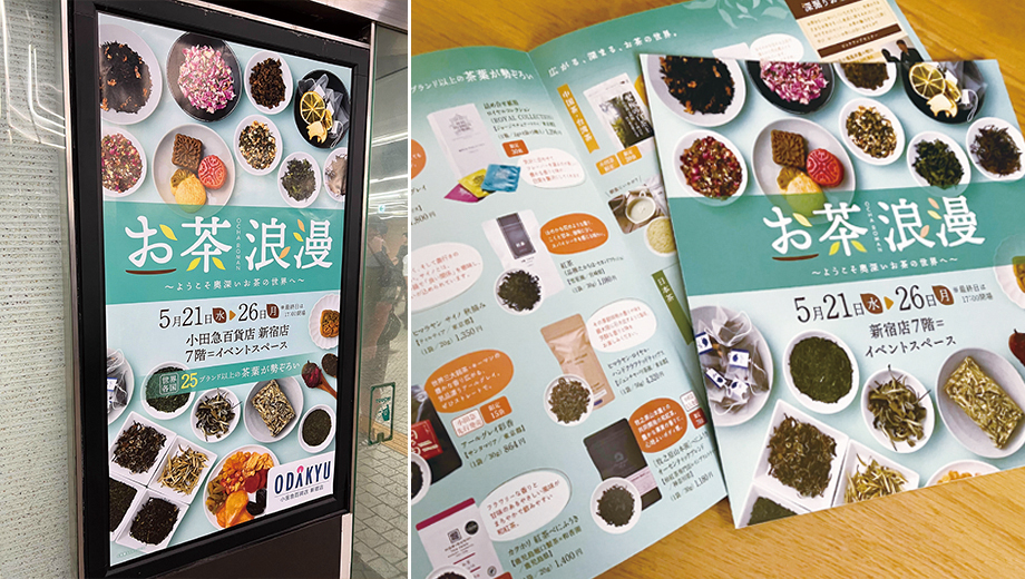 若者離れと言われているにも関わらず、ハマる人はとことんハマるお茶の世界。きっとこの文化に触れた人は、「浪漫」を感じたのではなかろうか?ふと、そんな考えから「お茶浪漫」というタイトルを提案した。覚えやすく、奥ゆかしさがあり、どこかドキドキするような感覚もするものができたと思う。このタイトルの世界観をより強くするべく、ビジュアルはお茶の個性を見せる茶葉の集合写真とした。催事に期待する豊富な品揃えを思わせ、インパクトのある仕上がりとなった。